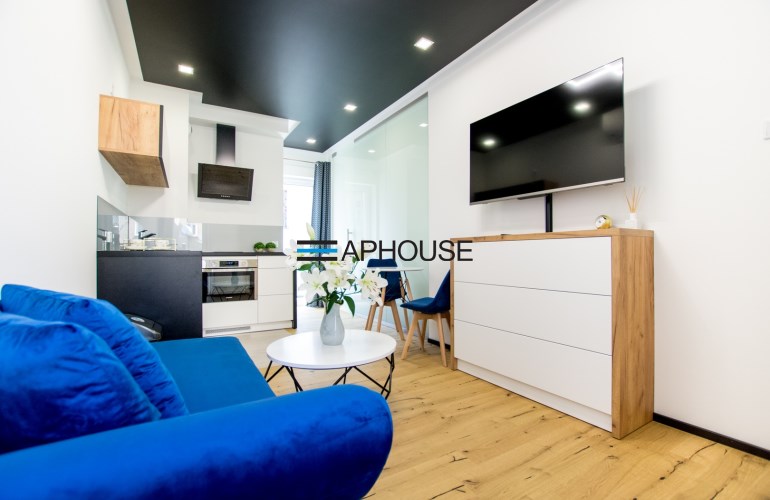 The apartment is stylishly decorated with attention to every detail of the finish. Bright living room with separated kitchen, sofa with a sleeping function for 1 person, coffee table, smart TV, glass table with chairs. The kitchen is fully equipped (dishwasher, under-counter fridge with freezer compartment, double induction hob, oven, hood). The bedroom has double bed and chair. Modern bathroom with shower and small washing machine. The advantage is air conditioning and additional equipment (vacuum cleaner, iron, ironing board, standing dryer, bedding, kitchen equipment).
