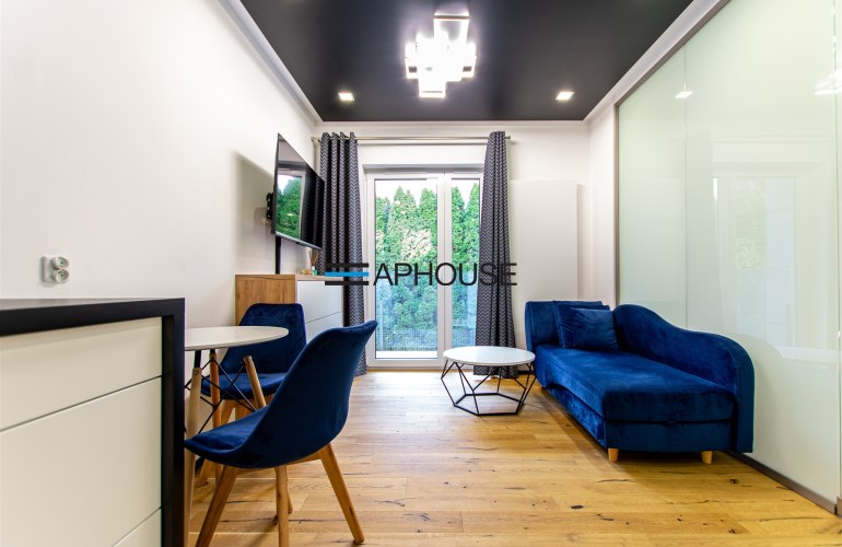 The apartment is stylishly decorated with attention to every detail of the finish. Bright living room with separated kitchen, sofa with a sleeping function for 1 person, coffee table, smart TV, glass table with chairs. The kitchen is fully equipped (dishwasher, under-counter fridge with freezer compartment, double induction hob, oven, hood). The bedroom has double bed and chair. Modern bathroom with shower and small washing machine. The advantage is air conditioning and additional equipment (vacuum cleaner, iron, ironing board, standing dryer, bedding, kitchen equipment).