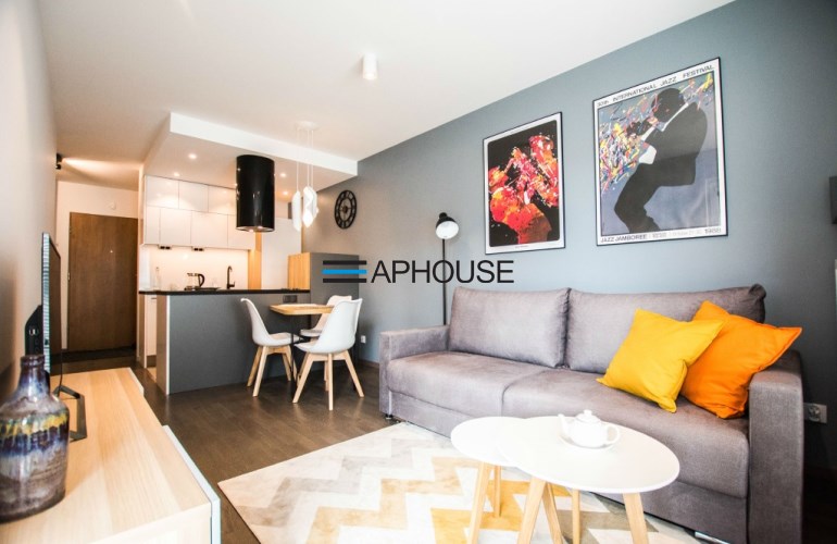 The kitchen is equipped with fridge, freezer, dishwasher, oven, hood, hob and a table with chairs. The spacious hall is equipped with a wardrobe and intercom. Bathroom has a sink, shower, washer, toilet and mirror. The bedroom is equipped with dobule bed and spacious wardrobe. From the living room is a balcony. The apartment is fully furnished and equipped, ready to move.